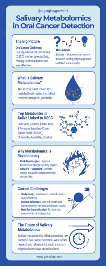 Now, imagine applying this science to saliva. That’s salivary metabolomics—a cutting-edge approach that could make early detection of diseases like OSCC much simpler and less invasive.